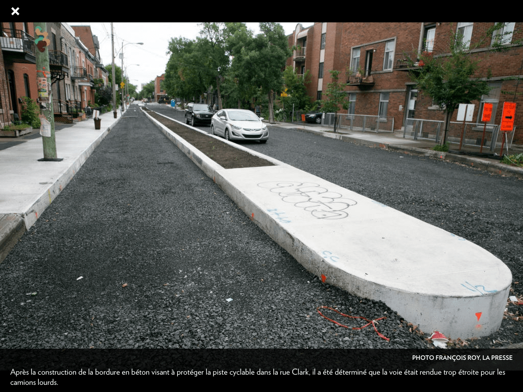 Ceci sans oublier la bordure en béton qui fut construite sur la rue Clark et qui a coûté des centaines de milliers de dollars (voir photo de LaPresse ci-jointe) :