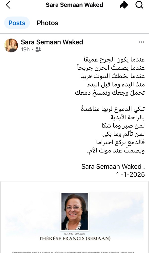 مع ان رحيل والدتك تيريز آلمني كثيراً إلا ان الكلمات التي خطّيتِها إثْرَ وفاتها كان لها بالغ الأثر عليَّ وعلى كلّ من يقرأها! محظوظات هنّ الأمهات اللواتي يحظين بهكذا كلمات لدى حلول ساعتهنَّ!